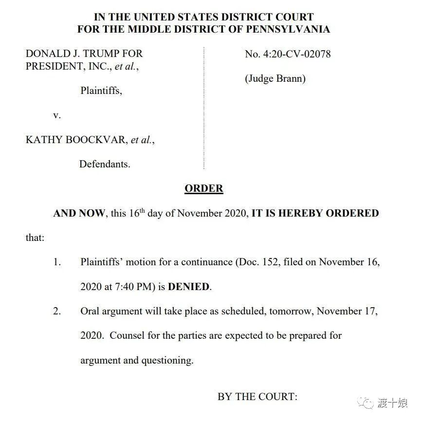 周一的重头戏在宾夕法尼亚。川普在宾州的诉讼步亚利桑那州诉讼的后尘,虎头蛇尾:以虚张声势推翻选举结果的“大案要案”起诉,面临败诉,再退缩成只涉及几百票(AZ)上千票(PA)的争议 —— 拜登在宾州领先近7万票,即便川普赢了官司也不影响选举结果。亚利桑那的官司,川普律师上周五表示打下去没有意义,已撤诉。
