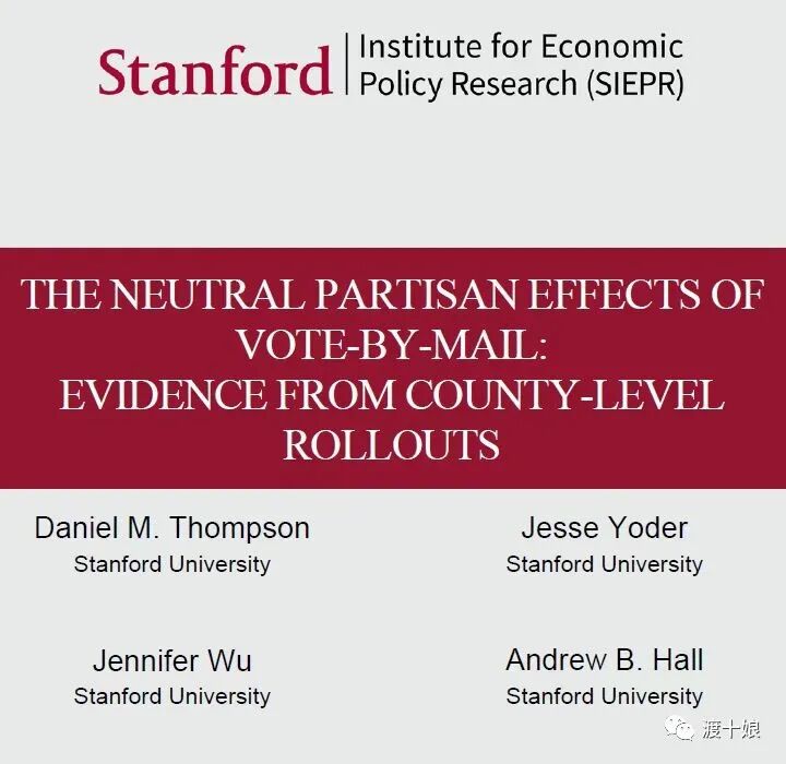 今年4月,斯坦福政治学教授安德鲁·霍尔和三位研究生发表了一篇论文,《邮寄投票的党派中立效应:来自郡县选举的证据》,算是这一问题的最新总结和更新。他们选用加利福尼亚、犹他和华盛顿三州从1996年到2018年的数据,辅以从私人公司得到的选民投票纪录。这三州的邮寄投票是逐郡推广的,在一段时间内,有的郡允许邮寄,另有郡只能去投票站。这样,霍尔教授他们就能比较两类郡县对本州同一候选人(州长、参议员等)的投票结果,量化计算邮寄投票的效应。
