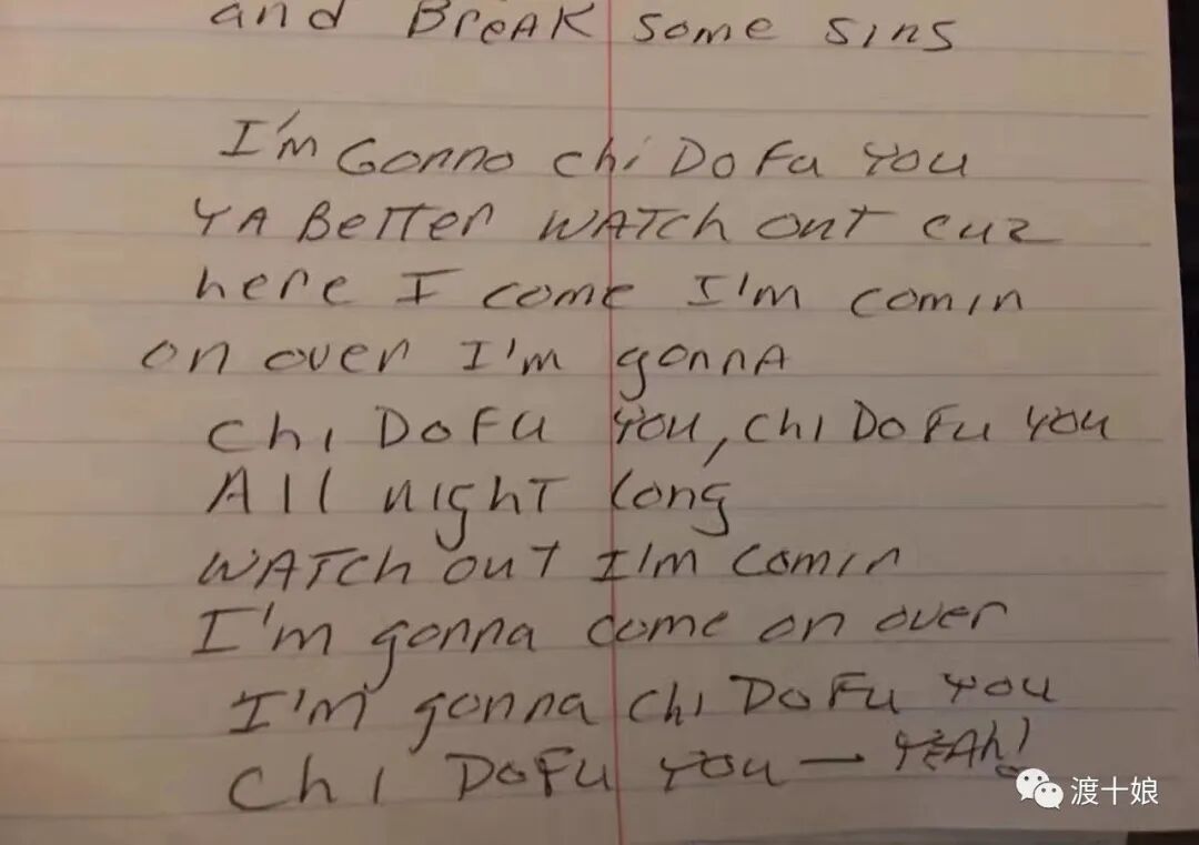 我抢过他的歌词本,看到了歌曲《我要吃你豆腐》(I’M GONNA CHI DOFU YOU)。突然想起前一阵子,我确实有教过他“吃豆腐”这个词,在中国民间博大精深的深层涵义。他居然用这个词来表达他对我的爱情!