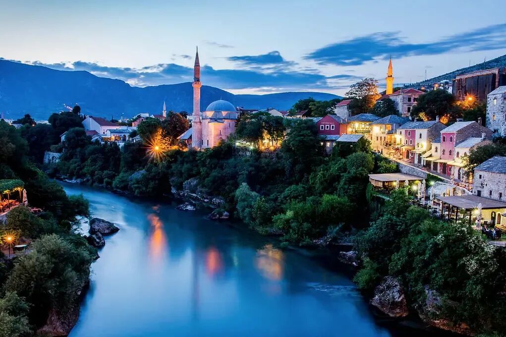 慨叹着历史的诡谲,我们走向了叧一座现代大桥。小河在这里拐了弯,桥一端是波黑内战后修葺的图书馆,另一端是遍布残屋旧房的山头。大桥傍着青山,河影辉照夕阳,共绘黄昏美意。
