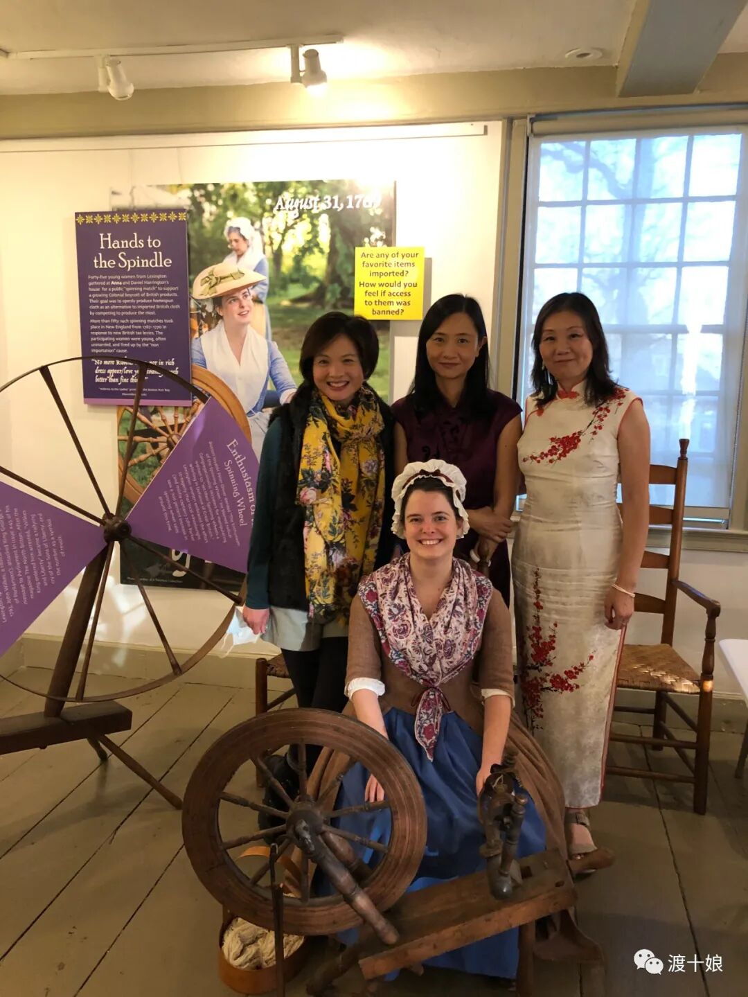 参与历史重现的华裔义工们。墙上照片再现了茶危机期间莱镇妇女为了抵制英国进口而进行纺织比赛的场景。脚踏纺车为当年文物。