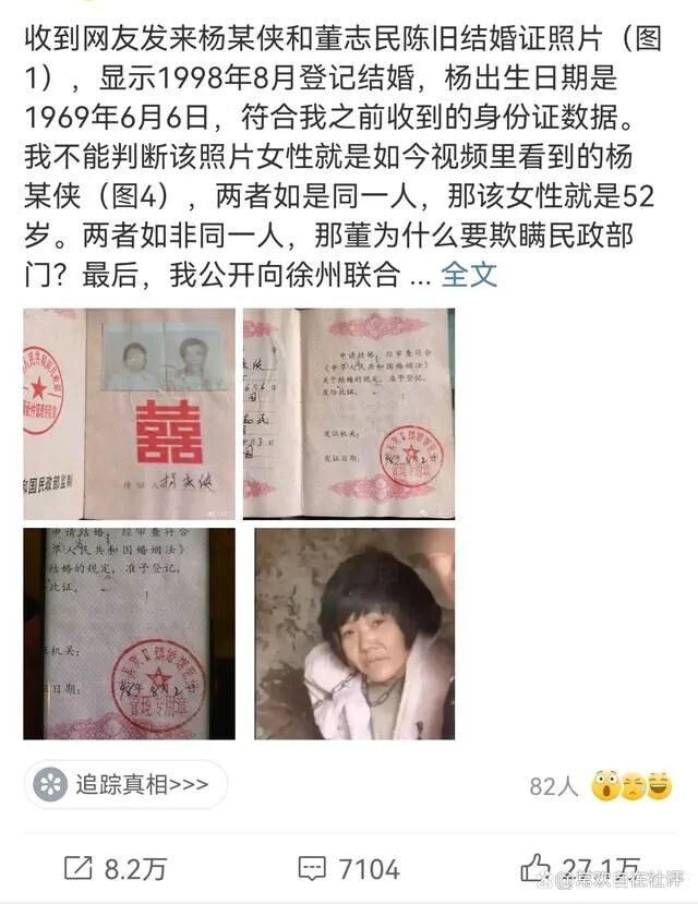 小花梅是谁?我问这个问题,大家又要笑:不就是那个云南亚谷村人么?的确,最近她和徐州丰县董某的结婚证又被爆出来了。我们大致画了一幅她的肖像图:她从云南的穷乡僻壤嫁人、离婚、疯癫、被带去富裕一些的江苏治病、疑似被拐卖、又“跑丢”、“被捡”……然后到了那张结婚证后,忽然变成了另外一个人出场了——