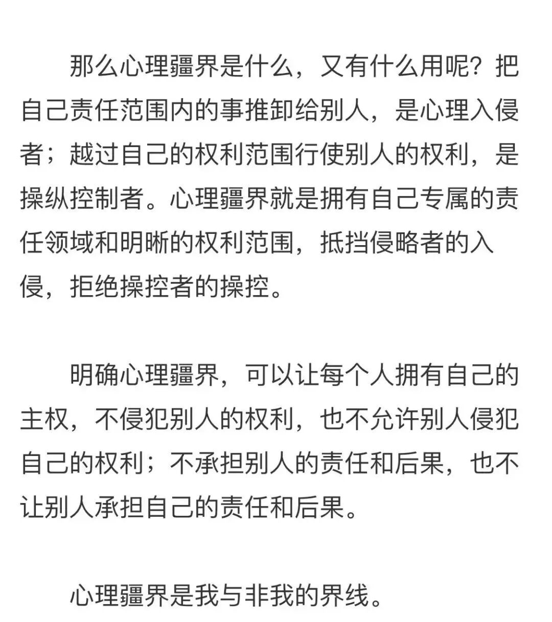 曾经读过一本书就是有关人与人之间的BOUNDARIES (疆界), 人与人之间需要有界限,不仅是不熟悉的人与人之间界限分明, 好朋友之间也需要有界限,不能越界,就像国家之间越界了,就成了侵略,人与人之间越界了,也会令人有被 “侵略”的感觉。其实, 越是亲密的亲人之间, 越需要有明确和稳固的心理疆界。