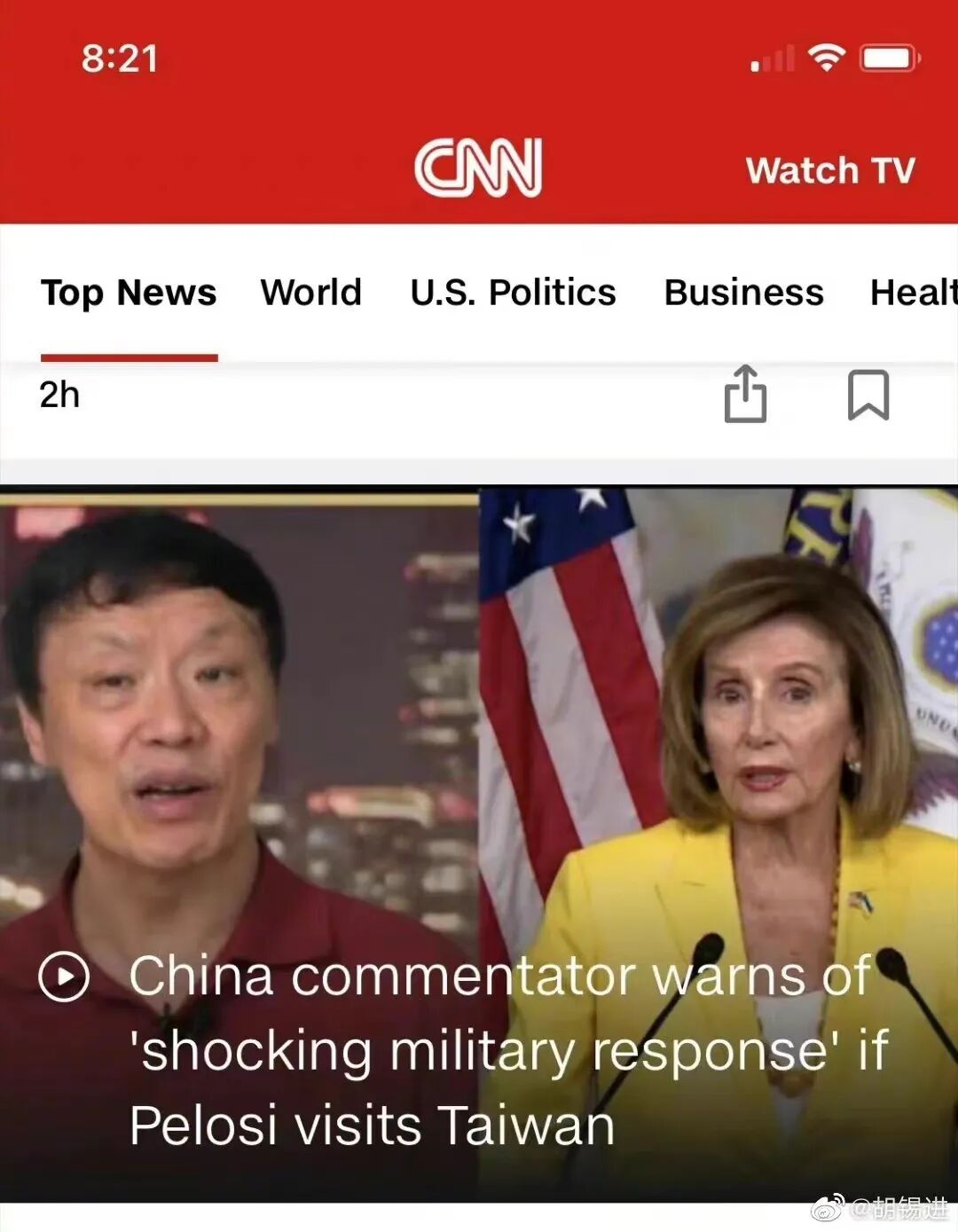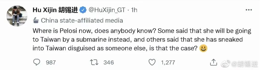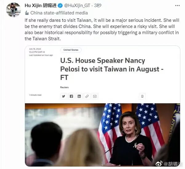 今摘录《环球时报》前总编胡锡进,自7月19日至8月3日期间,公开发表于微博有关佩洛西窜访的系列文章。