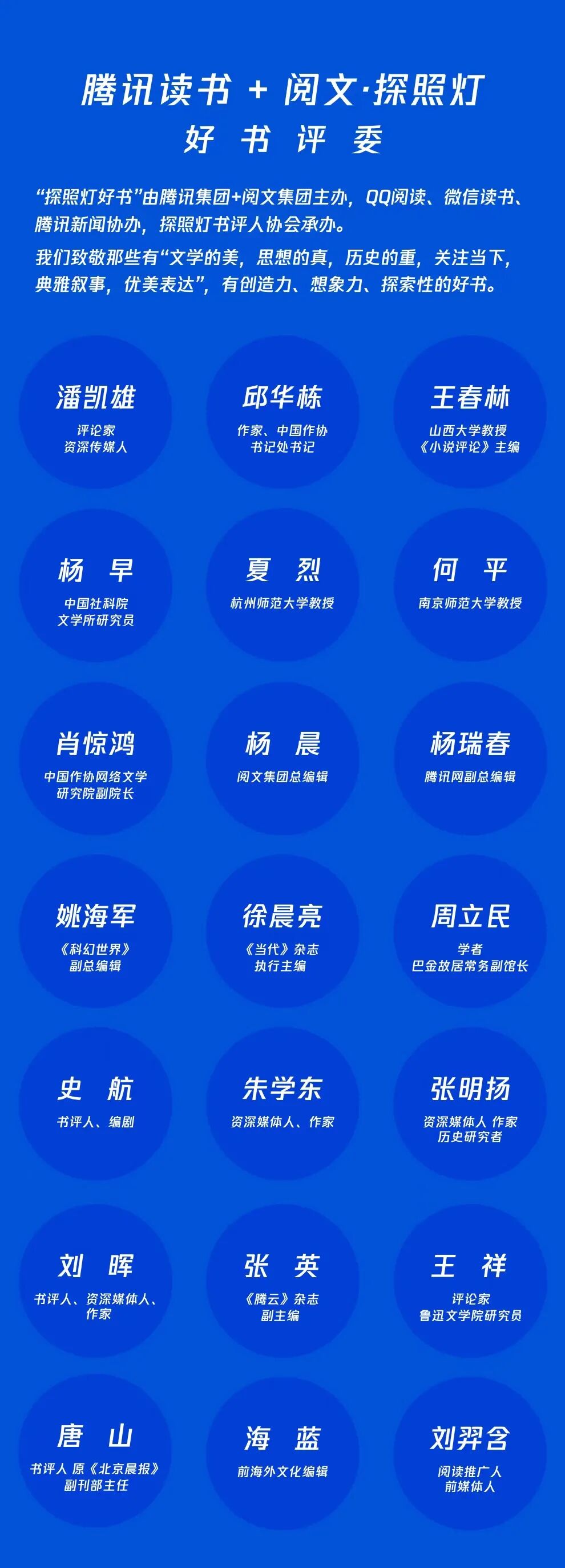 “探照灯好书”由腾讯集团+阅文集团主办,QQ阅读、微信读书、腾讯新闻协办,探照灯书评人协会承办。根据21位读书人投票,每月评出10本中外小说、10本中外类型小说、15本中外人文社科好书。根据读者投票,评出每月3个榜单的人气Top3好书。