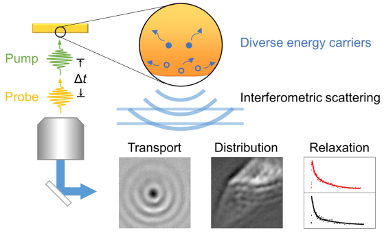 光电界面携能载流子的时空演化与能源、催化和传感等领域紧密相关,是近年来物理、化学和材料等领域的研究热点之一。载流子的迁移、分布和弛豫是影响材料功能的关键之所在,南京大学化学化工学院生命分析化学国家重点实验室康斌、徐静娟团队结合飞秒泵浦-探测技术和干涉散射显微术,研制成国际上首台飞秒干涉散射显微镜(Femto-iSCAT),并成功获得发明专利授权。该仪器作为一个通用测量平台,实现了超灵敏、高通量观测各种材料中的载流子迁移、分布和弛豫动力学。通过干涉放大效应和空间光场调制,瞬态图像对比度相比于传统方法提升了2个数量级以上,可探测极微弱载流子信号,从而有利于揭示超导材料、二维材料及新型光电材料中的稀奇科学现象。Femto-iSCAT相比于传统瞬态显微镜,极大拓展了材料的适用范围,以极高灵敏度和检测通量实现了载流子时空演化的多功能成像,助力界面能量和载流子转移等超快过程的研究。
