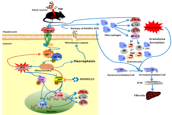 肝脏纤维化是慢性肝脏疾病发展到肝硬化、肝癌的必经病理过程。血吸虫病的主要病理损伤是肝脏纤维化,截止到2019年底我国仍有晚期血吸虫病人3万余人,但临床上还没有根本有效的抗纤维化的药物,且肝纤维化的机制未完全阐明。近日,南京大学生命科学学院华子春教授团队与江苏省血吸虫病防治研究所开展研究,发现RIP3缺乏可减轻日本血吸虫诱导的肝纤维化。RIP3-JNK- cJUN/Egr1轴正反馈调节炎症因子和ROS的产生,从而激活HSC,促进血吸虫肝纤维化。抑制JNK可预防血吸虫病肝纤维化。因此,RIP3及其信号通路可能是致病性肝纤维化的新药物靶点。该研究进一步阐明了肝纤维化形成的分子机制,为肝纤维化的药物研发提供新的思路。