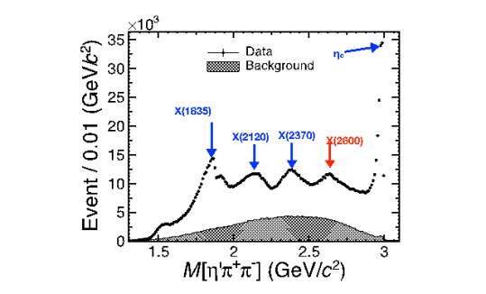 北京正负电子对撞机上的北京谱仪BESIII实验国际合作组利用已经收集的100亿J/ψ实验数据,在J/ψ->Υπ+π-η'过程中首次观测到X(2600)粒子。这一实验研究成果由南京大学物理学院金山教授与中国科学院高能物理研究所黄燕萍青年特聘研究员和娄辛丑研究员为主合作并指导博士生吴金飞完成。此次BESIII合作组在J/ψ->Υπ+π-η'过程中观测到的这一新粒子X(2600),实验确认其统计显著性大于20倍标准偏差,如图一所示,并测量到X(2600)的两个主要衰变模式f0(1500) η'和X(1540) η''的产额。这一结果是寻找研究新强子态领域又一新的重要成果。下一步在更多的衰变末态中寻找X(2600)粒子并测定其自旋宇称,对理解X(2600)粒子的本质至关重要。