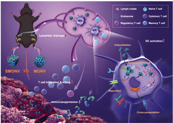 基于树突状细胞 (DC) 的抗肿瘤免疫疗法,可通过纳米粒子作为免疫佐剂负载肿瘤抗原,由其组成纳米疫苗发挥抗肿瘤作用。在此基础上,南京大学医学院附属口腔医院牟永斌教授团队与南京邮电大学滕兆刚教授团队合作,制备了一种柔性介孔有机硅基纳米疫苗(SMONV),并研究了该纳米疫苗机械性能对DC介导免疫应答的影响及相关机制。 研究发现,SMONV因其柔性可促进DC对抗原蛋白更多的摄取,通过内体逃逸诱导大量抗原的胞质递送,引起DC有效成熟和抗原交叉提呈。 此外,柔软特性使SMONV提升了体内抗原的淋巴引流效率,激活了高效的体液和细胞免疫。荷瘤小鼠纳米疫苗接种的结果进一步表明,皮下注射SMONV可高效诱导抗原特异性CD8+ T细胞免疫响应,改善调节性T细胞介导的免疫抑制,增强记忆T细胞介导的免疫记忆,有效抑制荷瘤小鼠的肿瘤生长。 此外,SMONV和抗PD- L1抗体联合应用可进一步增强其抗肿瘤效果。这一工作证明了纳米颗粒的机械性能在DC介导的抗肿瘤免疫中发挥着重要作用,为未来抗肿瘤疫苗的机械性能设计提供了参考。