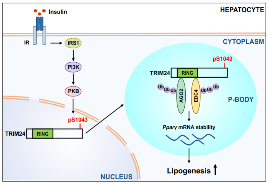 TRIM24响应胰岛素通路调节P-body功能的模式图