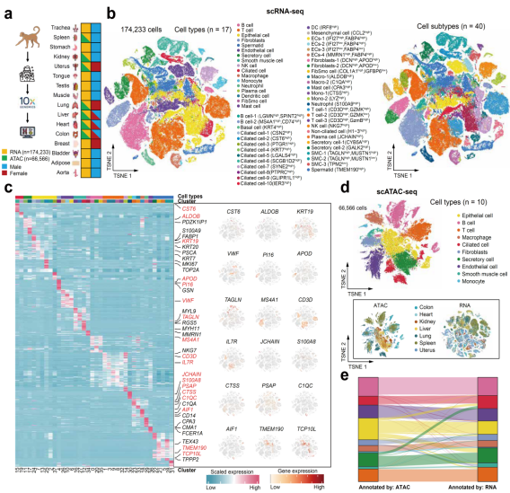 食蟹猴多器官单细胞多组学参考图谱构建与分析(a)实验设计;(b-c)细胞类型鉴定;(d-e)两种组学数据的整合与一致性分析