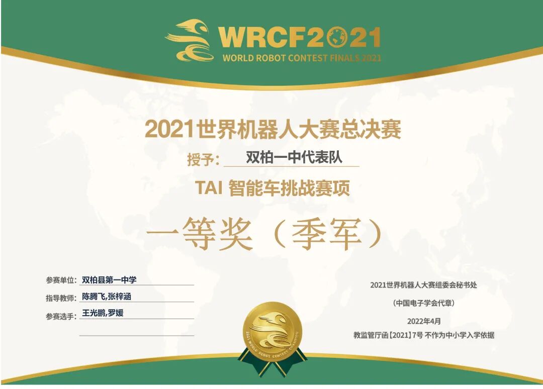 在刚刚结束的世界机器人大赛(World Robot Contest)中,由南京大学第23届研究生支教团陈腾飞、张梓涵、许凯和双柏一中陈剑元老师指导、带队的双柏一中代表队获得了2021世界机器人大赛总决赛TAI智能车挑战赛项一等奖,并以赛项第三名的好成绩荣获大赛季军称号。