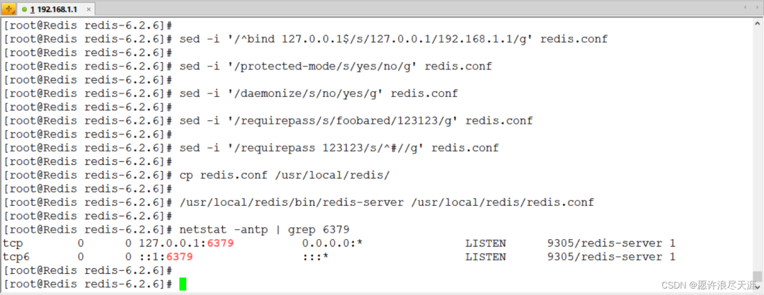 [root@Redis redis-6.2.6]# sed -i '/^bind 127.0.0.1/s/127.0.0.1/192.168.1.1/g' redis.conf # 修改监听 IP