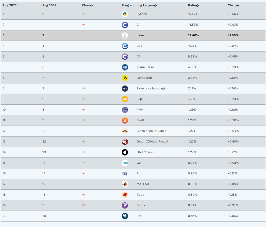 TIOBE 编程社区指数(The TIOBE Programming Community index)是编程语言流行度的指标,该榜单每月更新一次,指数是根据网络搜索引擎对含有该语言名称的查询结果的数量计算出来的。包括流行的搜索引擎,如谷歌、必应、雅虎、维基百科、亚马逊、YouTube 和百度都用于指数计算。 具体的计算方式见这里:https://www.tiobe.com/tiobe-index/programming-languages-definition/。