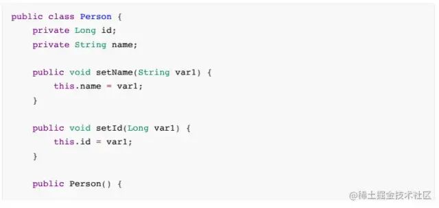 这时候再看⽣成的Person.class,可以发现Setter⽅法已经⽣成了: