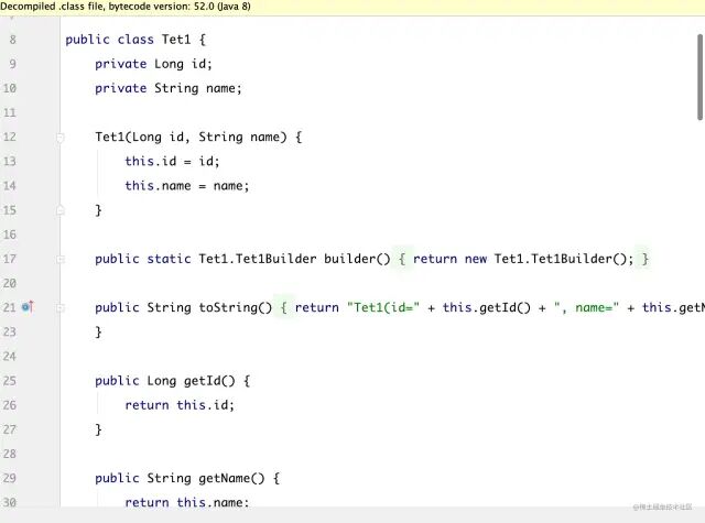 编译后的class为:可以看到 已经帮我们构建好了全属性的构造方法,但是如果值只引用@Builder注解是无法生成get和set的。