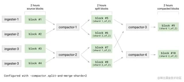 拆分阶段第一级是压缩。例如:2 小时内 compactor 将所有源数据库分割成 N 个组(通过-compactor.split-groups 设置)。对待每一个组 compactor 压缩数据块而不是生成单个的结果块,输出 M 个分割块(通过-compactor.split-and-merge-shards 设置)。每个分割块只包含了属于 M 碎片中给定碎片的序列子集。在分割阶段结束时,compactor 会参考块文件(meta.json)中各自碎片信息的引用来产生 N*M 个数据块。Compactor 合并每个碎片的分割块,将压缩给定碎片的所有 N 个分割块。合并将块数从 N*M 减少到 M。对于给定的压缩时间范围,每个 M 碎片都将有一个压缩块。如下图所展示的说明