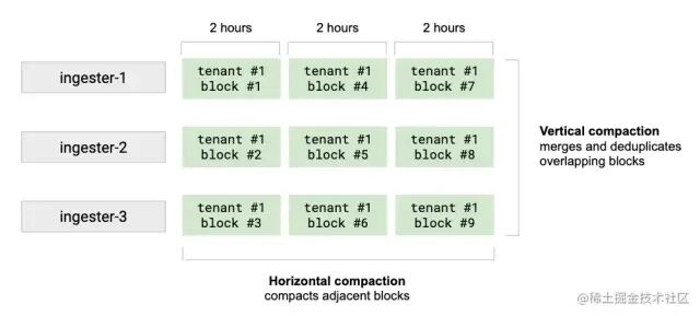 queriers、store-gateway 和 rulers 使用,用来发现数据中新增加的数据块和删除数据块按租户以固定、可配置时间间隔进行数据块压缩。垂直压缩将接收器在同一时间范围(默认情况下为 2 小时内)上传的租户的所有块合并到单个块中。它还对最初由于复制而写入 N 个块的样本执行重复数据消除。垂直压缩减少了单个时间范围内的块数。垂直压缩后触发水平压缩。它将几个具有相邻范围周期的块压缩为一个较大的块。水平压缩后,关联块块的总大小不变。水平压缩可以显着减小存储网关保存在内存中的索引和索引头的大小。如下图