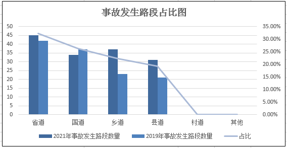 省道、国道、乡道交通事故高发,共占比80.74% 。省道、国道、乡道交通事故分别占比32.33%、26.30%、22.22%。