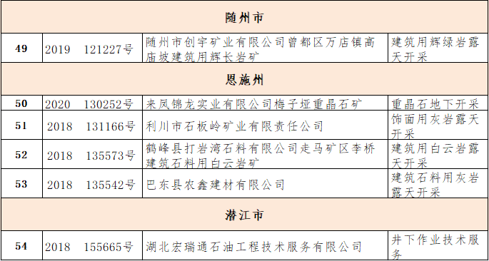 根据安全生产行政许可注销管理办法规定,对到期未申请延期的53家以及企业申请的1家(共54家)非煤矿矿山企业安全生产许可证予以注销。名单如下: