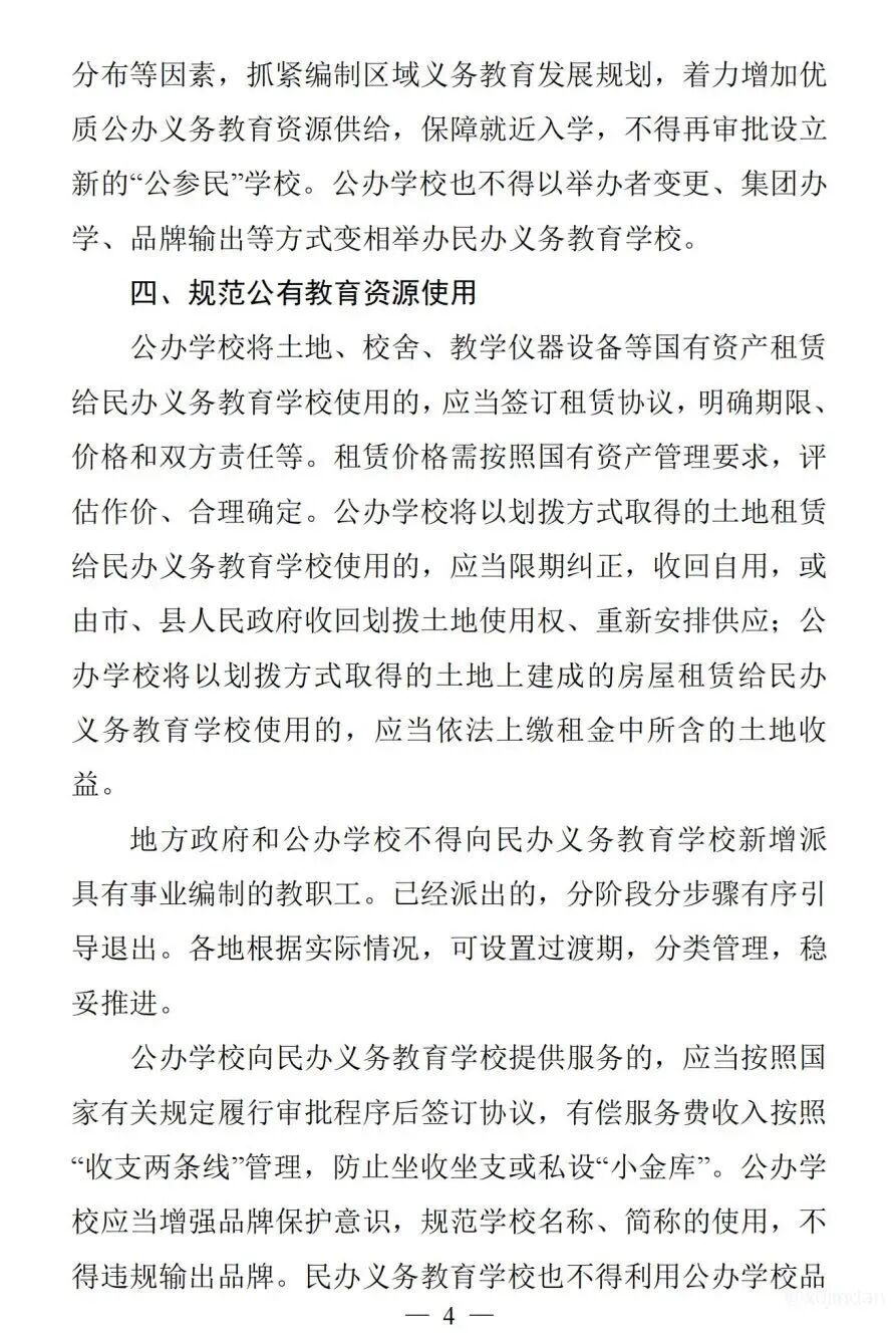 5、不再审批新的“公参民”学校,公办学校也不得以举办者变更,集团办学、品牌输出等变相举办民办义务教育。