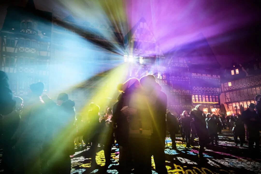 ▲ 2018年3月18日德国法兰克福,观众在音乐节期间观看灯光艺术。摄:Thomas Lohnes/ Getty Images