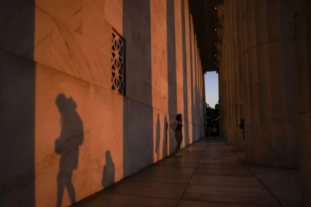 ▲ 2021年1月12日美国华盛顿特区林肯纪念堂,墙上投下了人们的影子。摄:Samuel Corum/Bloomberg via Getty Images