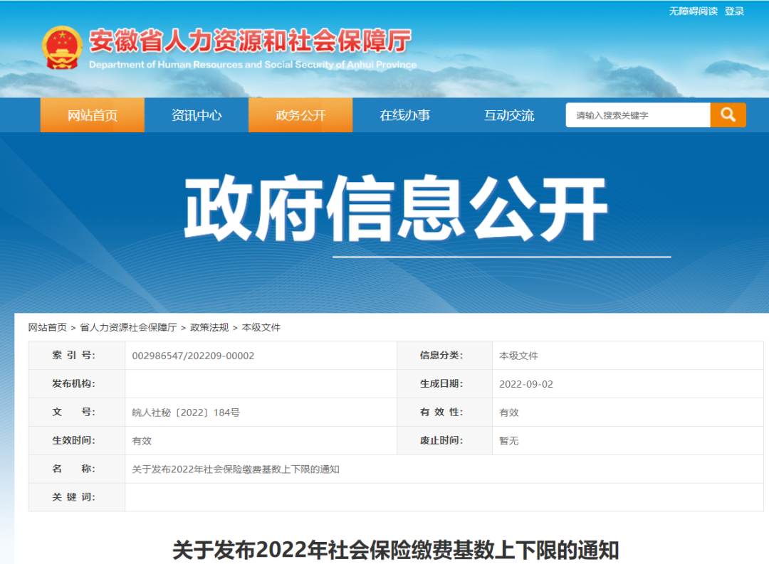 9月2日,安徽省人力资源和社会保障厅网站发布通知,公布安徽省2022年社会保险缴费基数上下限。