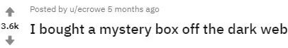 △ 《我在暗网上买了个福袋》,感兴趣的朋友可以阅读下https://www.reddit.com/r/nosleep/comments/90ksmo/i_bought_a_mystery_box_off_the_dark_web/