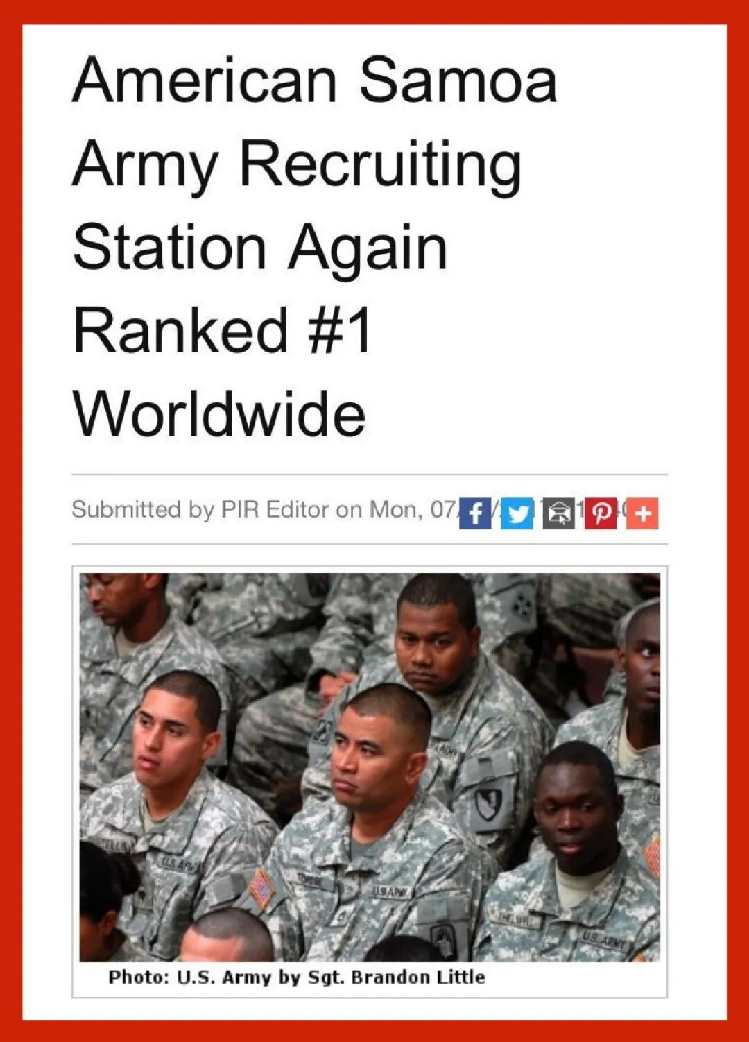 而美属萨摩亚的U.S Army征兵站,在全美885个陆军征兵站中招募人员全美第一。在2014年一年,美军在萨摩亚就招募了153名新兵。(数据来源于美国陆军征兵部USAREC)