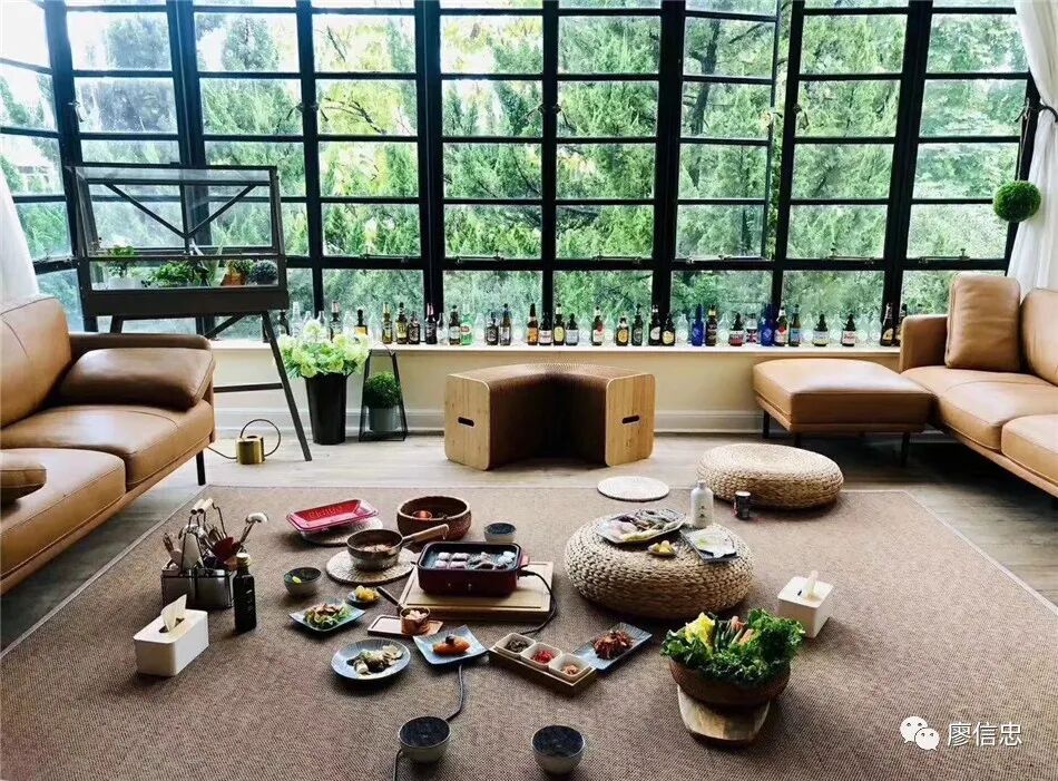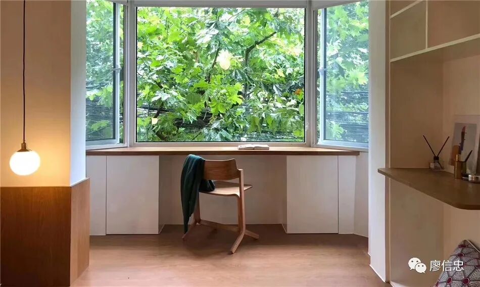 他的配色很简单:黑白灰,加各种深浅层次的原木色;这样的新式里弄,窗外的绿意盎然永远是让人眼前一亮之处,仿佛室内所有摆设都在衬托窗外风景。