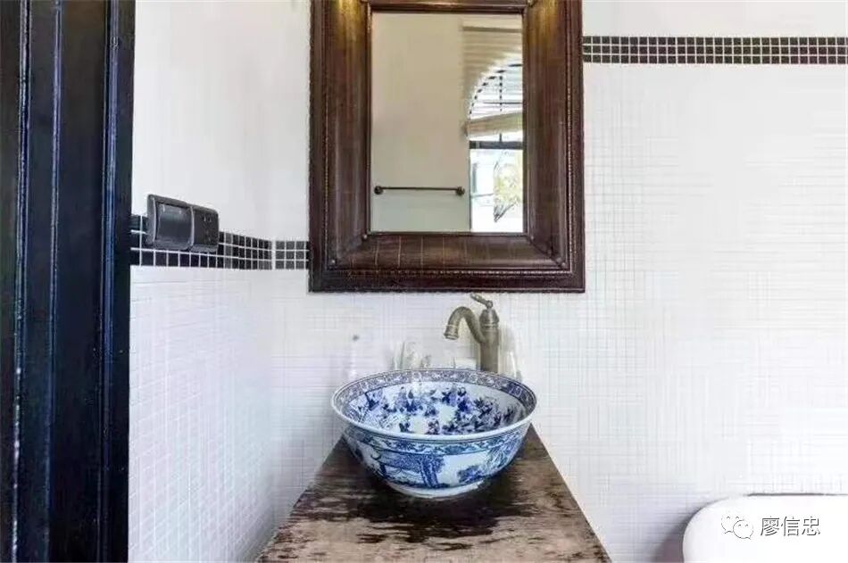 这价格区间的房,许多是涉外出租,所以在装修上,经常能看到一些"东方主义"违合感;像这明明就是个ArtDeco风格的卫生间,却装了一个假装青花瓷洗手台;这类洗手台大量出现在这价位的房源中。