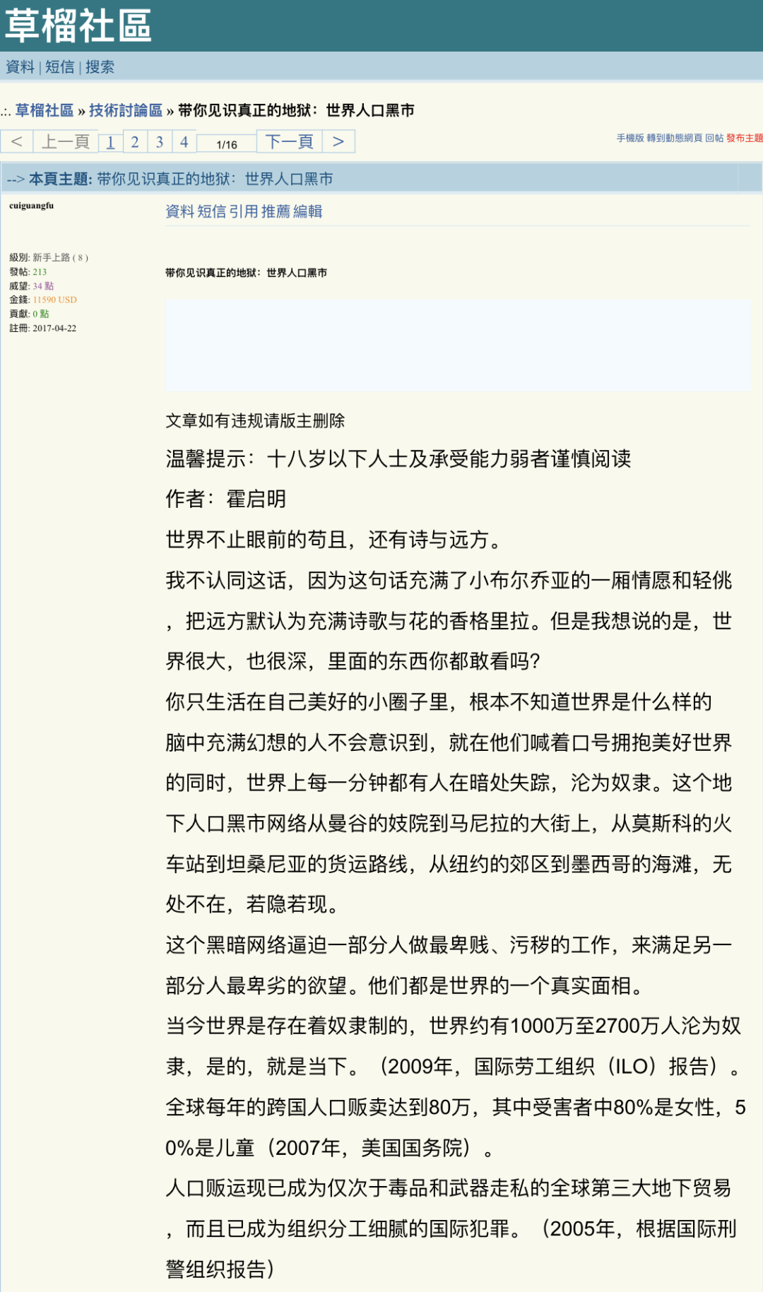 最早可以追溯到2017年,X博士早期文章《带你见识真正的地狱:世界人口黑市》就已经被转发至草榴。