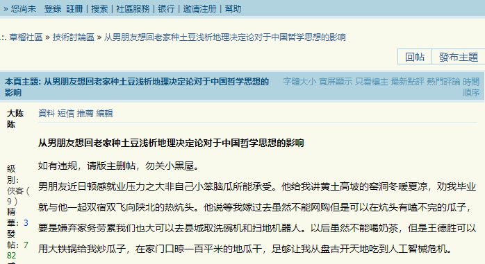 真正的草榴大神更推崇学以致用,她能从男朋友想回老家种土豆的想法,浅析地理决定论对中国哲学思想的影响。