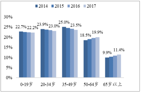 2014年到2017年间,我国男女20-34岁人口比例不断下滑,反之老龄化人口逐年增加。