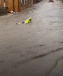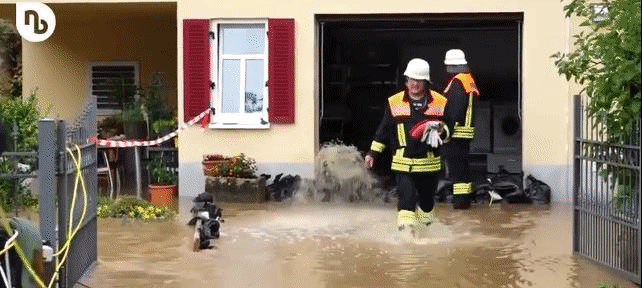救援现场也出现惊险的一幕,一消防员在救人过程中自己被卷入了洪水中,德国民众合力将消防员救出: