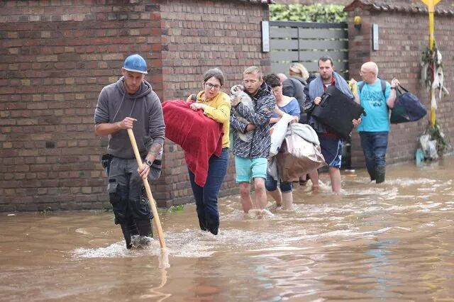 比利时一处灾区的居民在救援人员带领下撤离