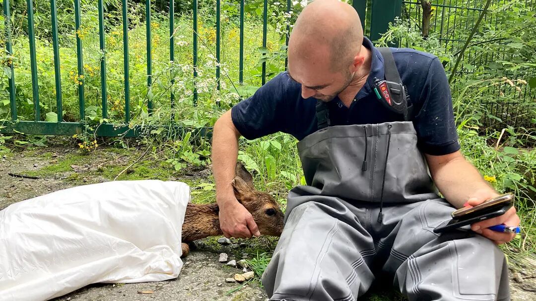 一消防员救出被洪水围困的小鹿: