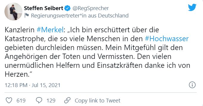 周四,德国总理默克尔的发言人Steffen Serbert发推,表示正在访美的默克尔“对这场灾难感到不安”,“我向死者和失踪者的家属表示同情。我从心底感谢救援人员。”