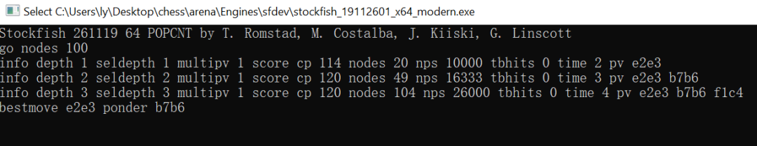 双击打开这个exe文件,输入go nodes 100。如果有结果输出(如图),即说明Stockfish主程序已成功下载;如果没有任何输出,请从新下载一个其它的Stockfish。输出的含义是Stockfish在计算了100个局面后,认为最好的走法是e3,黑棋的最佳应对是b6(好弱)。