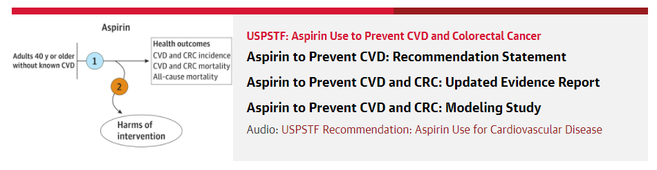[1] US Preventive Services Task Force. (2022). Aspirin Use to Prevent Cardiovascular Disease: US Preventive Services Task Force Recommendation Statement. JAMA, doi:10.1001/jama.2022.4983
