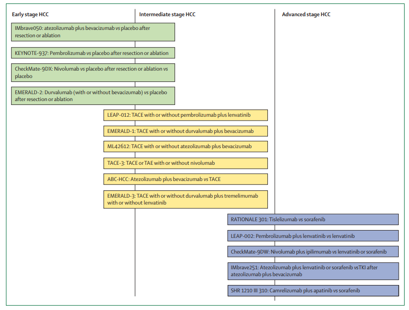 ▲目前正在开展的肝细胞癌3期免疫治疗临床试验(图片来源:参考资料[1])
