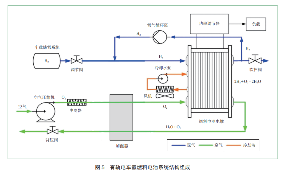 针对采用无网供电技术的车辆,氢燃料具有较好的适应性,如有轨电车。应用于城轨车辆的氢燃料电池主要由氢燃料电池模块、散热冷却系统和车载储氢系统构成,图5是某有轨电车氢燃料电池系统结构组成。