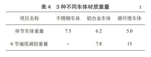 在满足使用车辆各项要求的前提下降低列车重量,可有效降低运营能耗和全寿命周期成本。对于车辆轻量化,目前常用方法为采用新材料、新工艺等实现整车的节能。如车体材料采用铝合金或碳纤维材料,以国内地铁6节编组B型车为例,采用不同材料的减重效果如表4所示。