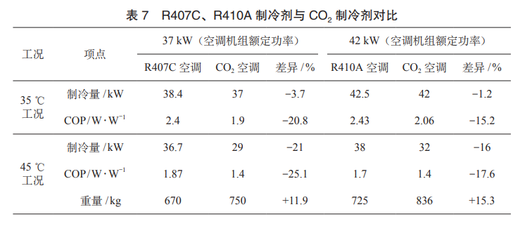 通过表7可以看出,目前,相对R407C、R410A制冷剂,CO2制冷剂的额定制冷量和能效比都相对较低,未来还需要通过技术突破,提高其制冷量和能效比,使其在城轨车辆领域获得更加广泛的应用。