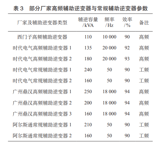 城轨车辆采用小型化、轻量化和高性能的高频开关辅助逆变器势在必行。高频辅助逆变器相比工频辅助逆变器,其开关频率大幅提升,可达到10~20kHz。高频隔离方式采用软开关技术提高开关频率,使辅助逆变器得以向小型化、轻量化和高性能化方向发展,从而达到节能目的。表3是部分厂家高频辅助逆变器与常规辅助逆变器的对比表。