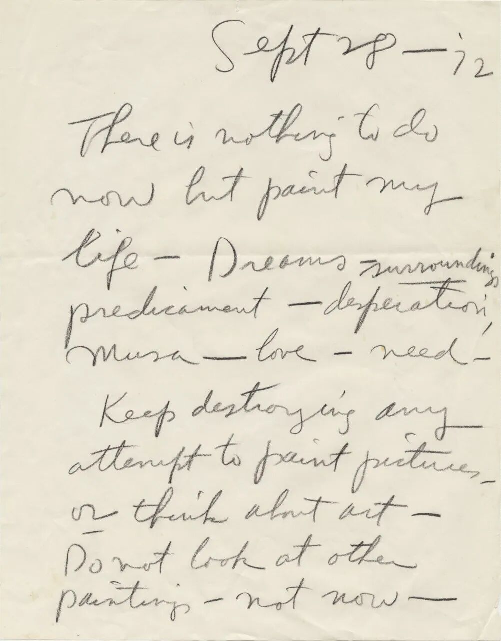 ▲ 菲利普·加斯顿(Philip Guston),1972年9月28日的工作室哦记录,8½ x 11打字纸,“现在无事可做,唯有描绘我的生活:梦想、周遭、困境、绝望、穆萨——爱与需求。继续摧毁任何绘画或思考艺术的尝试。不看其他画。现在不要。” © 菲利普·加斯顿艺术资产,图片:艺术资产、豪瑟沃斯