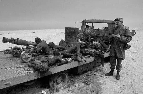 在科威特通往伊拉克的80号公路上,联军对撤退的伊拉克军队和难民进行了惨无人道的无差别轰炸,几万具四分五裂的尸体和上千辆坦克、车辆的残骸绵延数公里,伊拉克军人和难民的回家之路变成了“死亡公路”。
