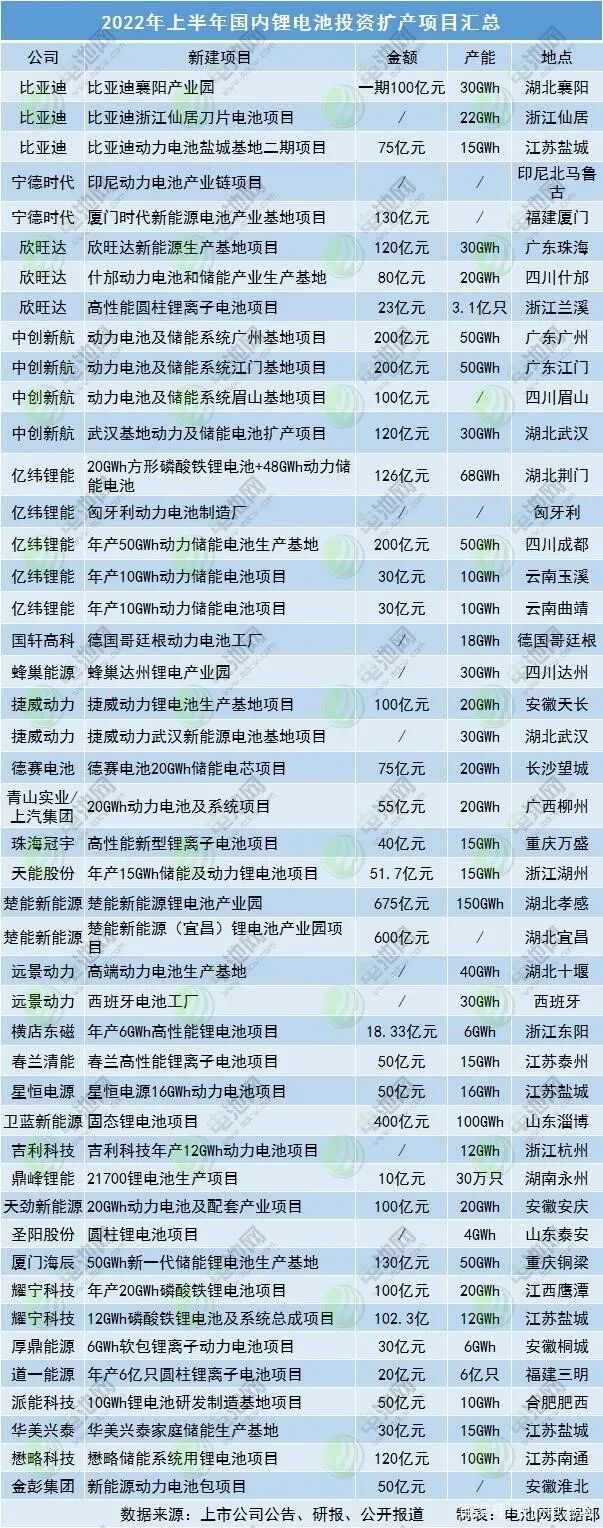 据电池网不完全统计,今年上半年以比亚迪、欣旺达、中创新航等为代表的锂电池企业相继公布了多个新投建项目。