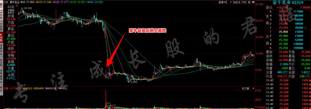 此后,已从牛市高点38元腰斩到14多块的伊利,继续腰斩,最低跌倒了6.45元,市值甚至不到50亿元,蒙牛在复盘后,更是一个猛子暴跌60%。